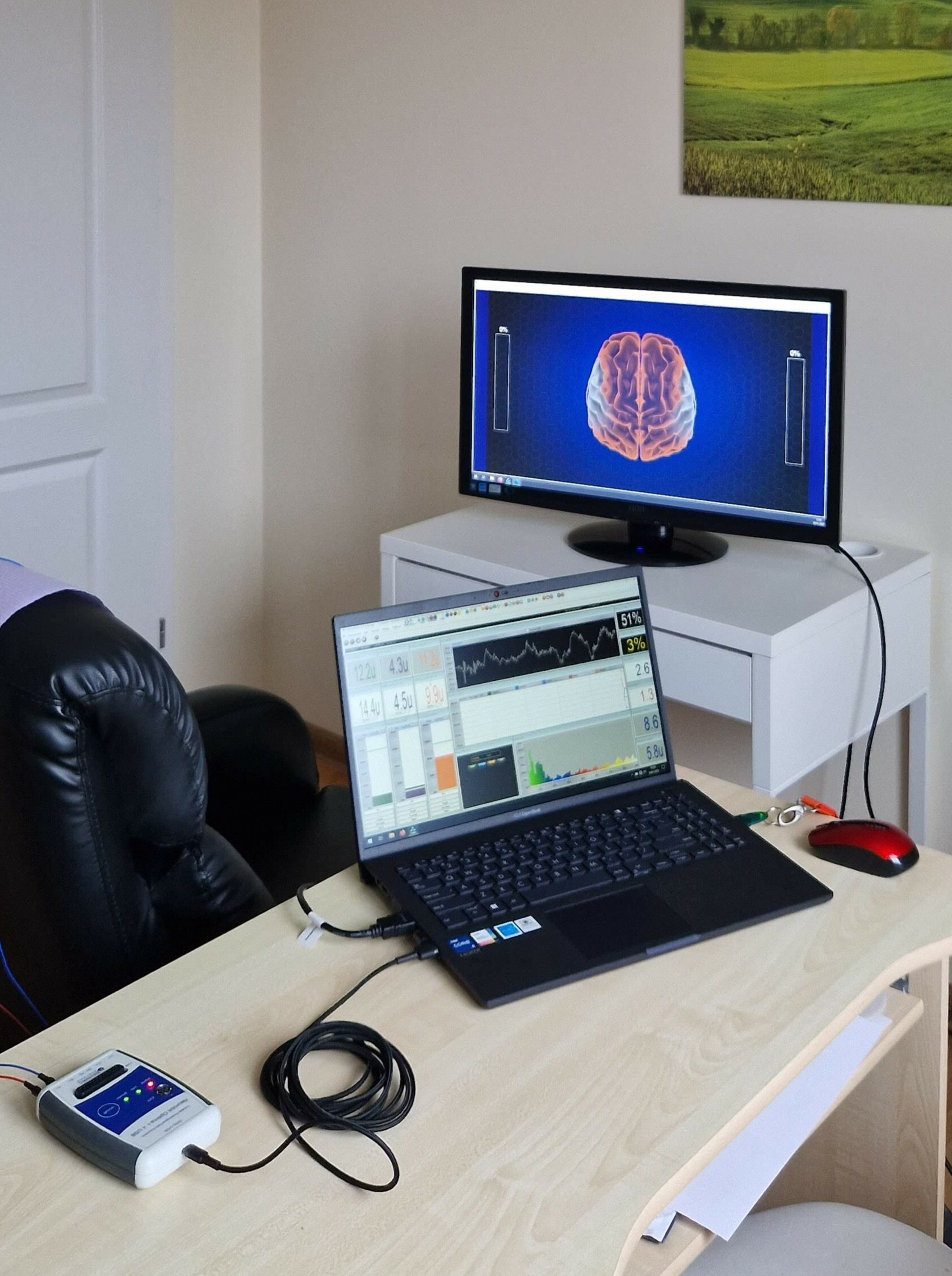 W swoim gabinecie wykorzystuję głównie EEG, czyli pomiar aktywności elektrycznej mózgu (neurofeedback). Dane zbierane są za pomocą elektrod rozmieszczonych na skórze głowy Klienta. Przedmiotem pomiaru są fale mózgowe różnych częstotliwości. W terapii i treningu najbardziej interesować nas będą fale Theta, Alfa, SMR, Beta i HiBeta oraz ich procentowy udział w ogólnym obrazie EEG.